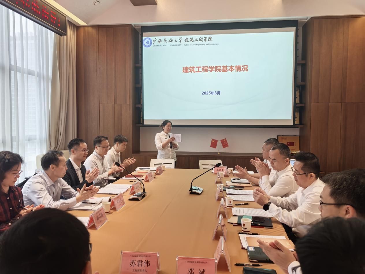 交流会上,广西启盛建设集团总经理邓国璋首先致欢迎词,并介绍了公司的发展历程、业务范围及未来规划。随后,覃祖聪书记介绍了公司发展情况,详细阐述了此次调研的背景与目的,提出在人才培养、实习基地建设等方面的合作需求。广西启盛集团董事长陈之柱分享了企业文化与发展理念,表达了与高校共同探索智能建筑领域校企合作的愿景。