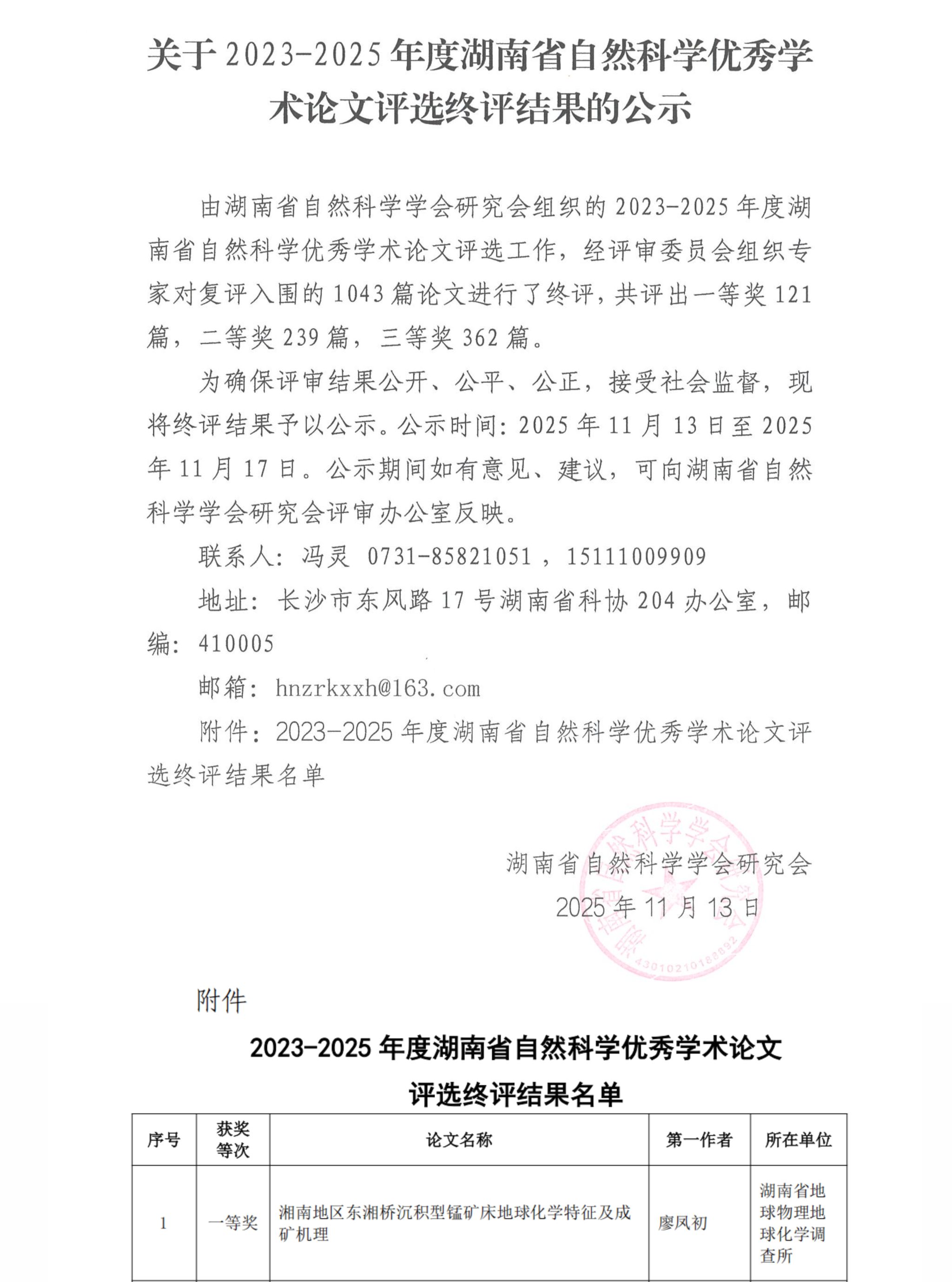 近日,2023-2025年度湖南省自然科学优秀学术论文终评结果公示,英国365集团岩土力学与地质过程团队刘湘华老师作为通讯作者的学术论文《湘南地区东湘桥沉积型锰矿地球化学特征及成矿机理》荣获一等奖。